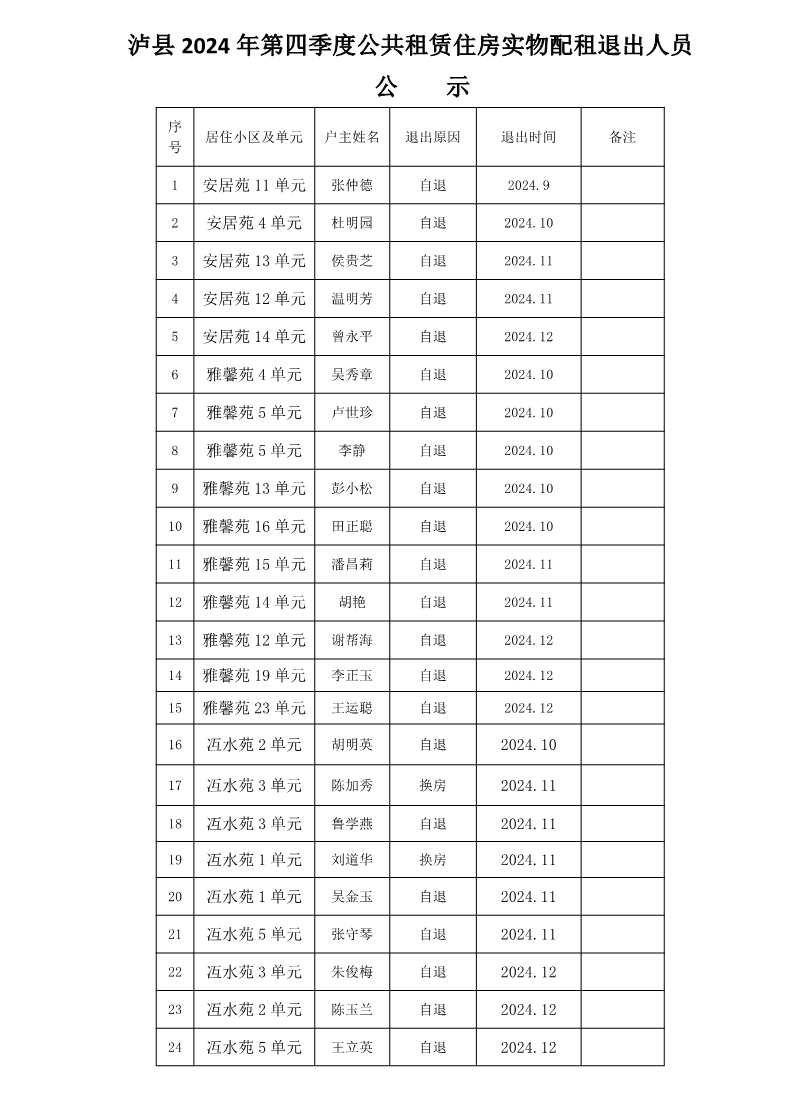 泸县2024年第四季度公共租赁住房实物配租退出人员公示 来源:县住房和城乡建设局 发布时间:2025-01-15 16:12:59 浏览次数: 次 【字体:小 大】 点赞 收藏 分享到: 【打印正文】 相关内容
