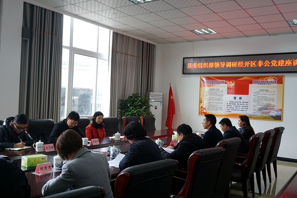 3月15日,县委常委、组织部部长张国华到县经开区、医药产业园调研园区非公党建工作。园区相关领导陪同调研。