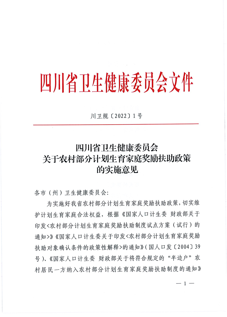 四川省卫生健康委员会关于农村部分计划生育家庭奖励扶助政策的实施意见 来源:卫生健康局 发布时间:2023-10-09 16:23:59 浏览次数: 次 【字体:小 大】 智能标签: 四川省 卫生健康 委员会 关于 农村 分享到: 【打印正文】 相关内容