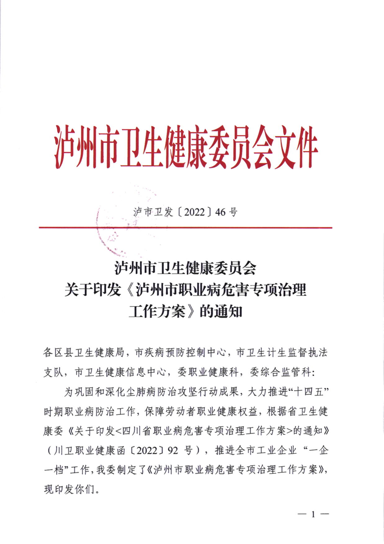 泸市卫发〔2022〕46号 关于印发《泸州市职业病危害专项治理工作方案》的通知 来源:泸州市卫生健康委员会 发布时间:2023-10-10 15:27:25 浏览次数: 次 【字体:小 大】 智能标签: 关于印发 泸州市 职业病 危害 专项治理 分享到: 【打印正文】 相关内容
