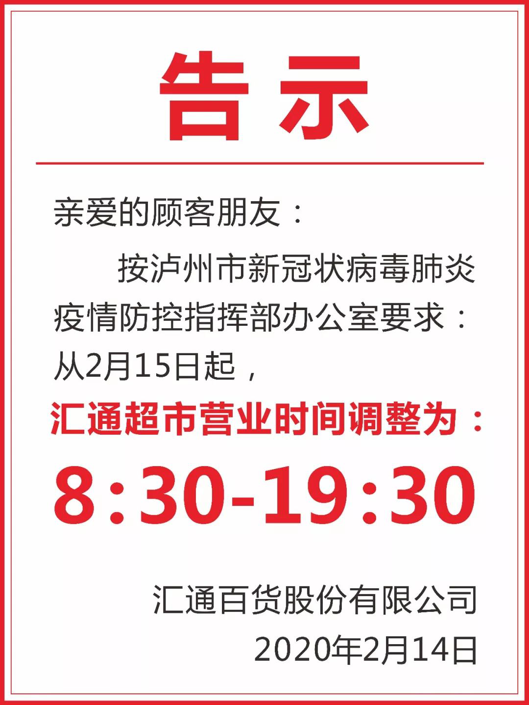 泸州市民注意:2月15日起 汇通超市营业时间将调整 来源:泸州新闻网 发布时间:2020-02-14 16:19:52 浏览次数: 次 【字体:小 大】 智能标签: 泸州 市民 注意 分享到: 【打印正文】 相关内容