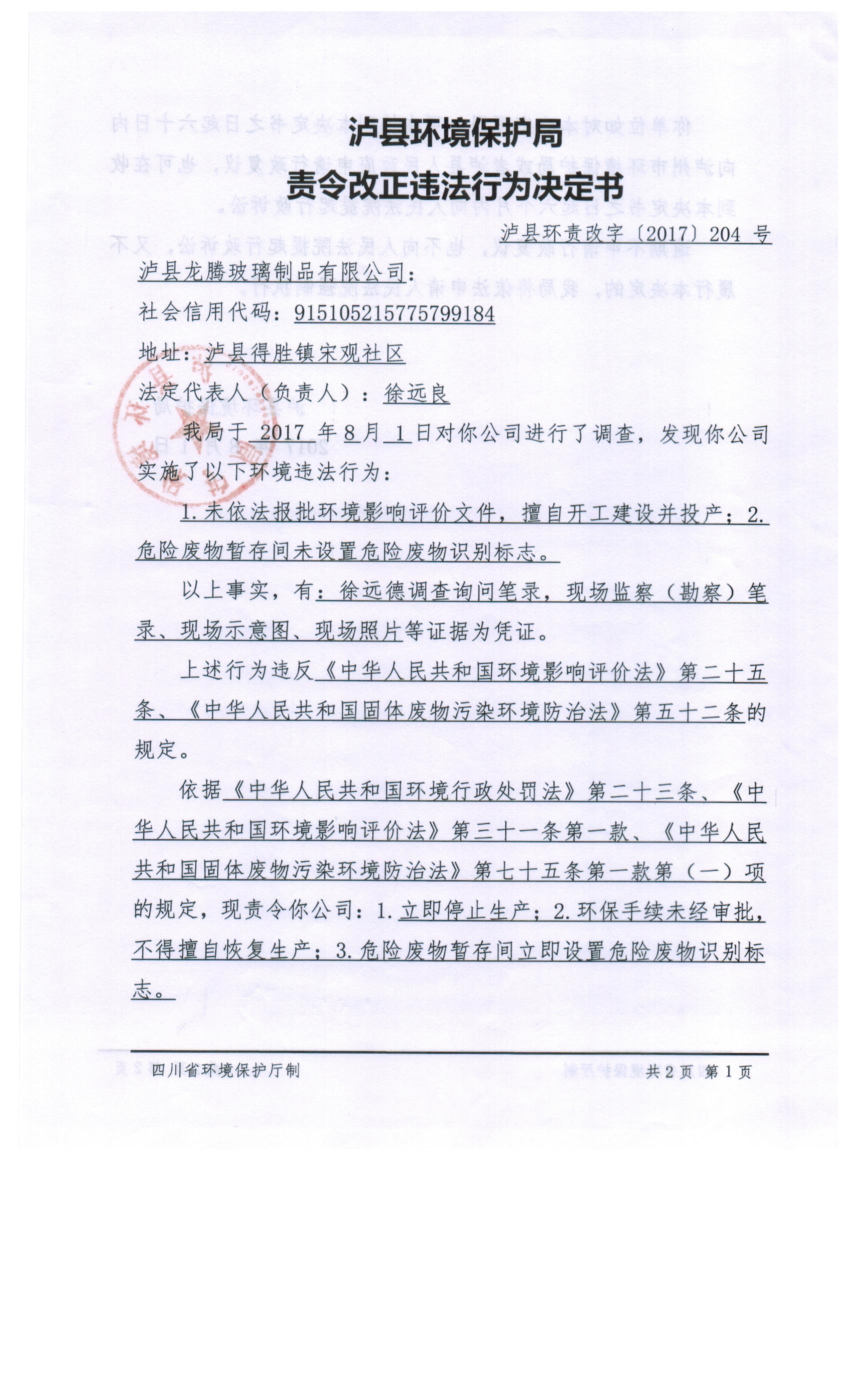 泸县环保局责令改正违法行为决定书书(l泸县龙腾玻璃制品有限公司) 来源: 发布时间:2017-08-10 10:15:00 浏览次数: 次 【字体:小 大】 智能标签: 责令改正违法行为决定书 分享到: 【打印正文】