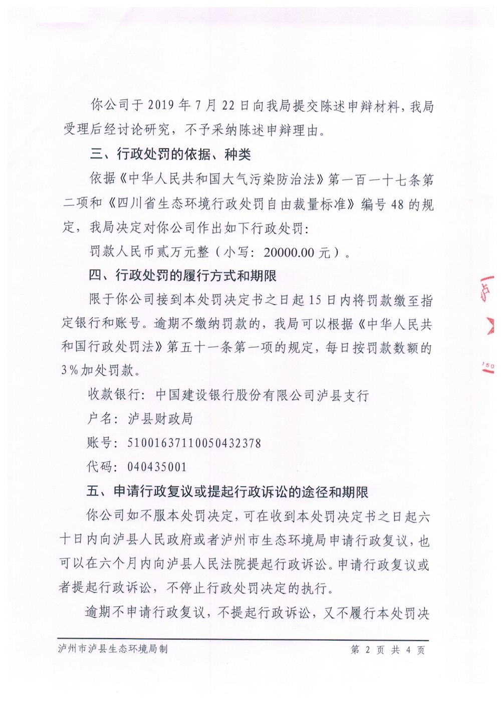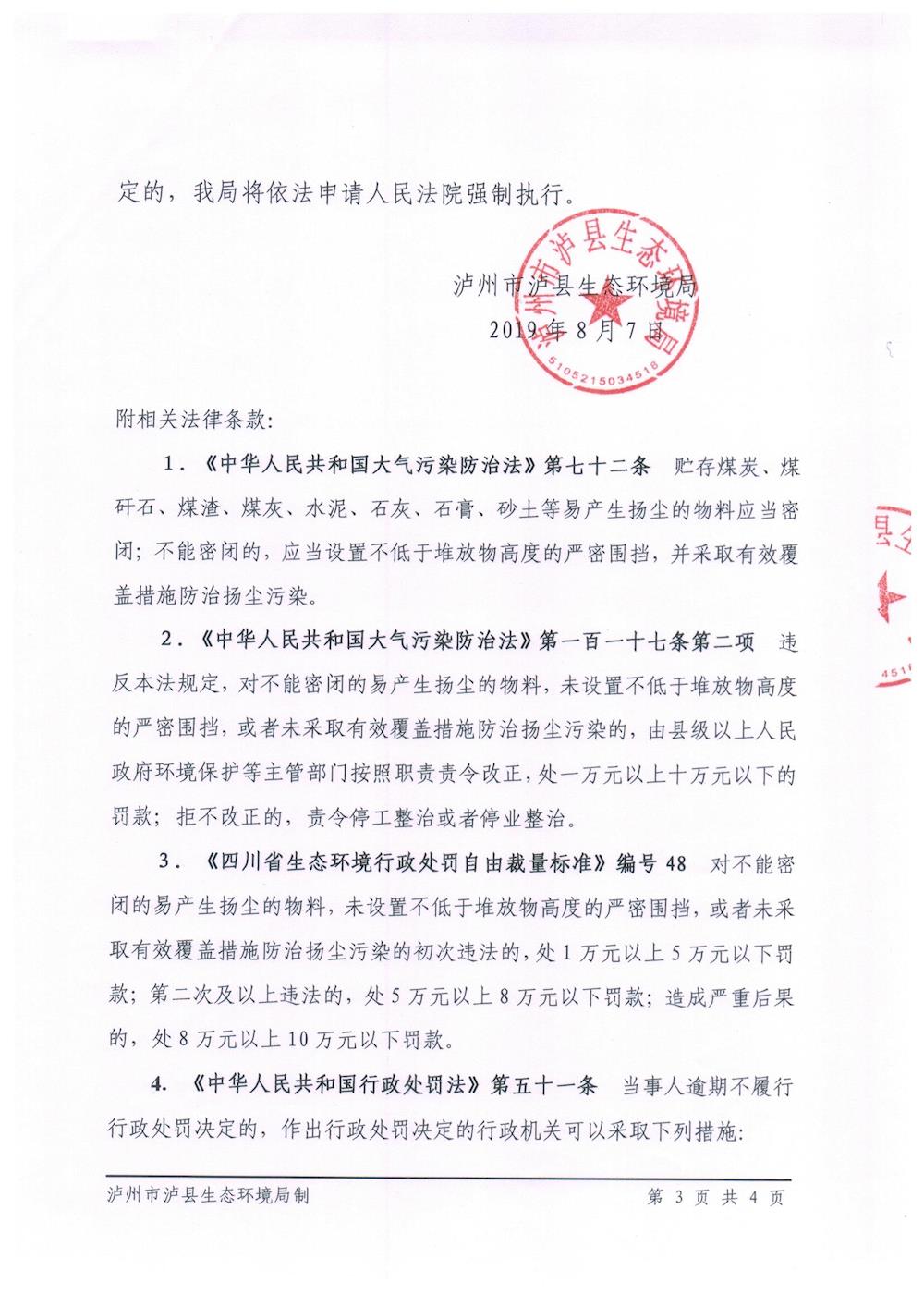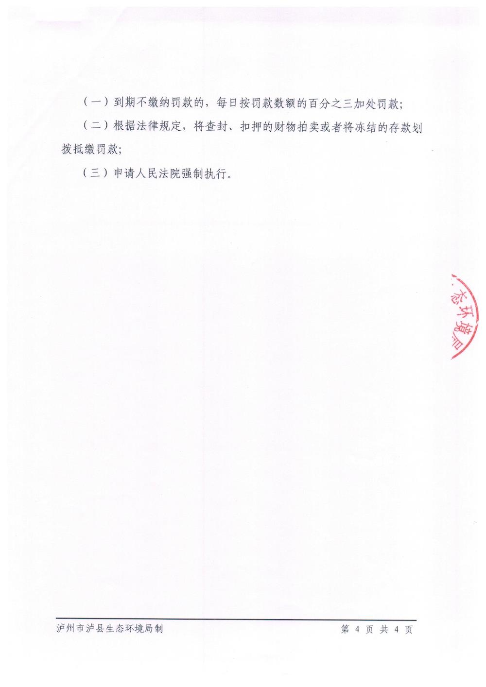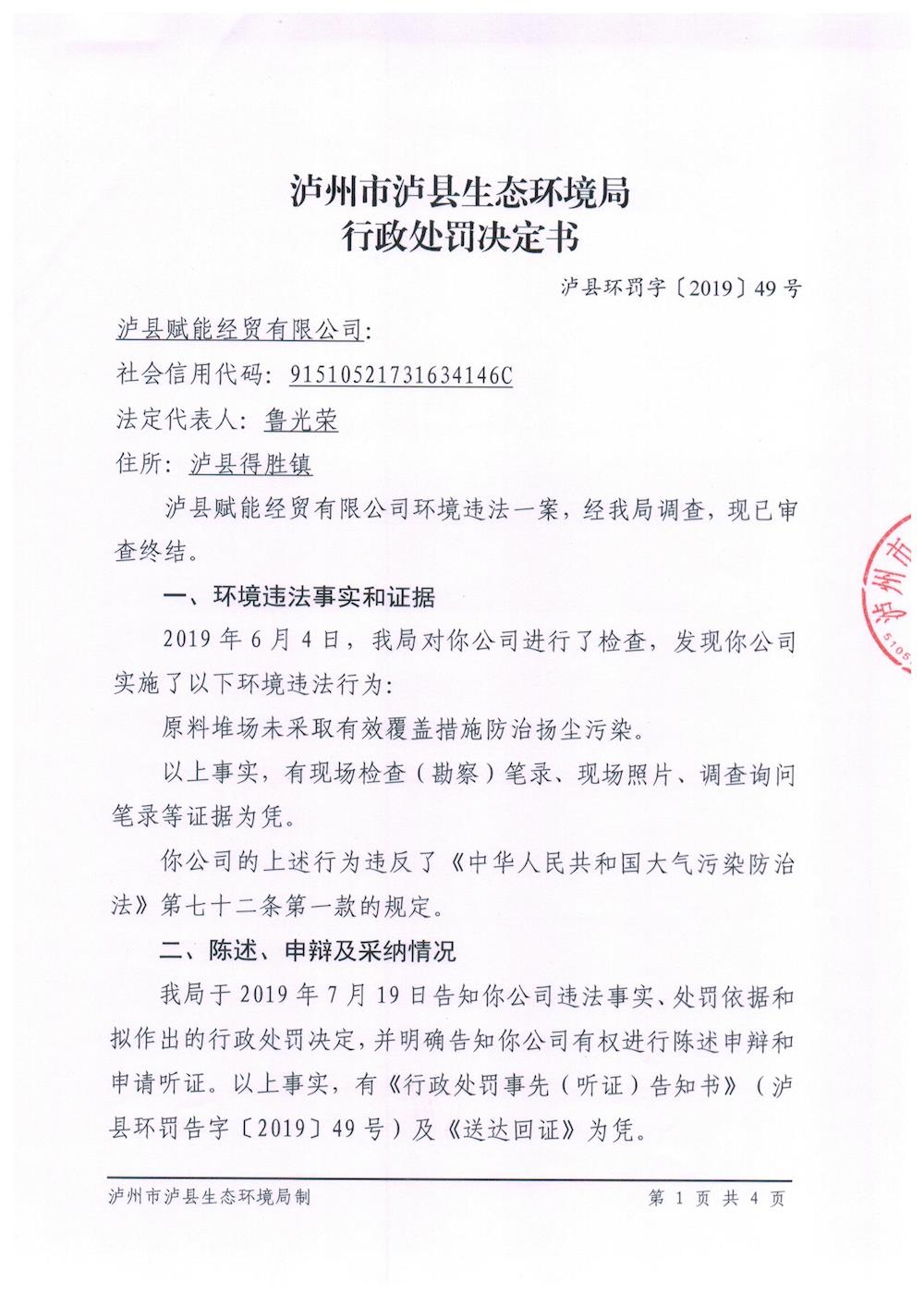 泸州市泸县生态环境局行政处罚决定书(泸县赋能经贸有限公司) 来源: 发布时间:2019-08-12 10:25:34 浏览次数: 次 【字体:小 大】 智能标签: 泸州市 泸县生态环境局 行政处罚决定书 分享到: 【打印正文】